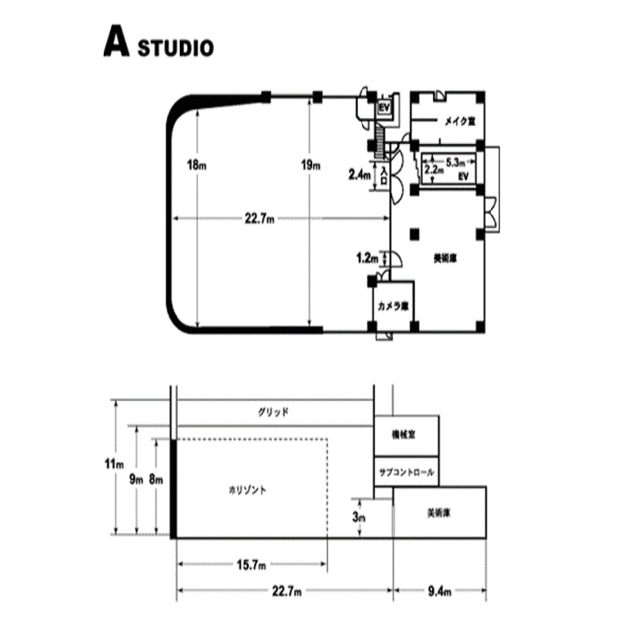 | 実効寸法 | 奥行22.7m×幅19m(中央)×高さ8m(ホリゾント丈) |